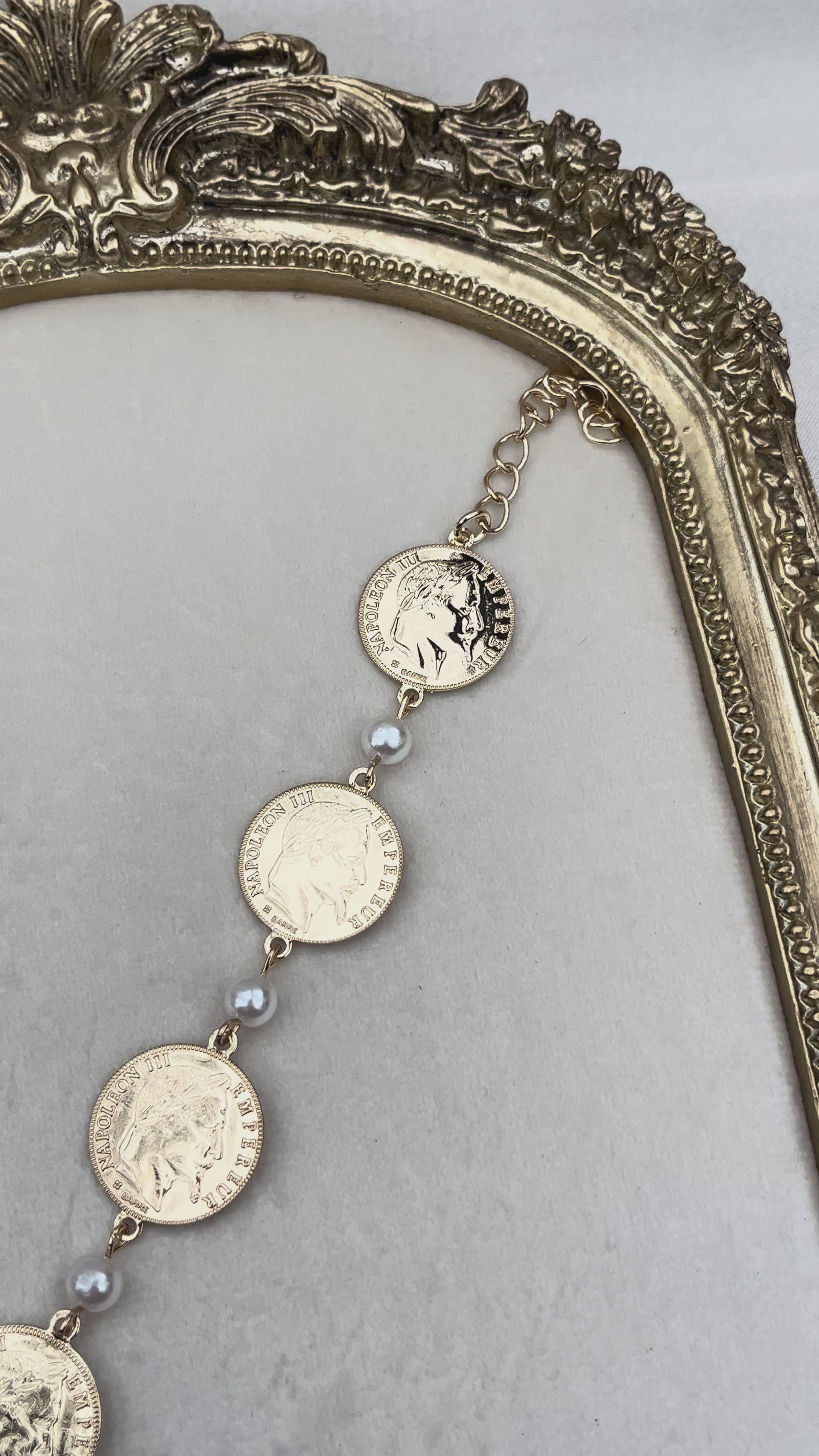Un bracelet raffiné composé de pièces dorées Louis associées à de délicates perles blanches nacrées.