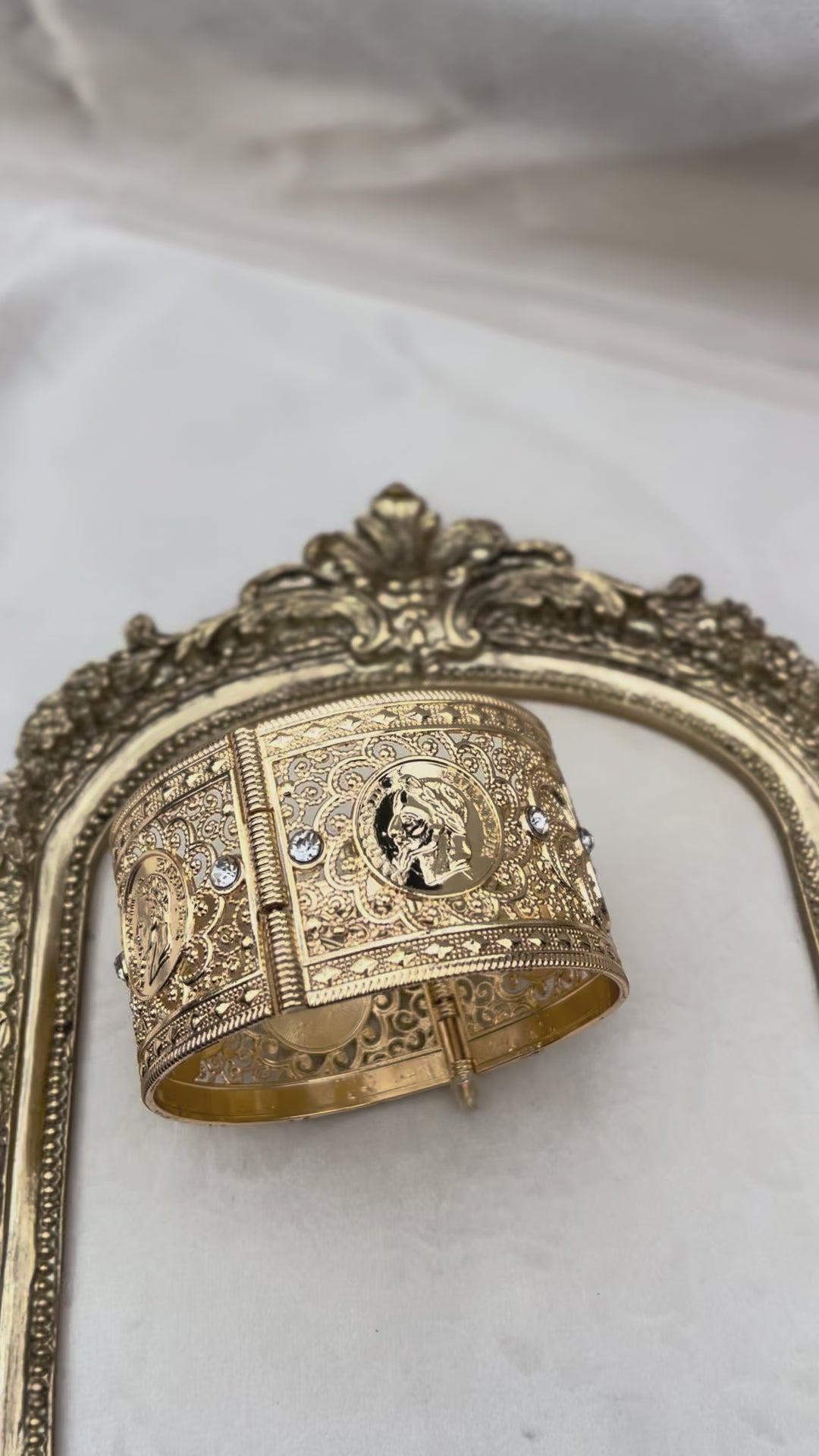Manchette dorée composée de pièces Louis et ornée de strass argentés.