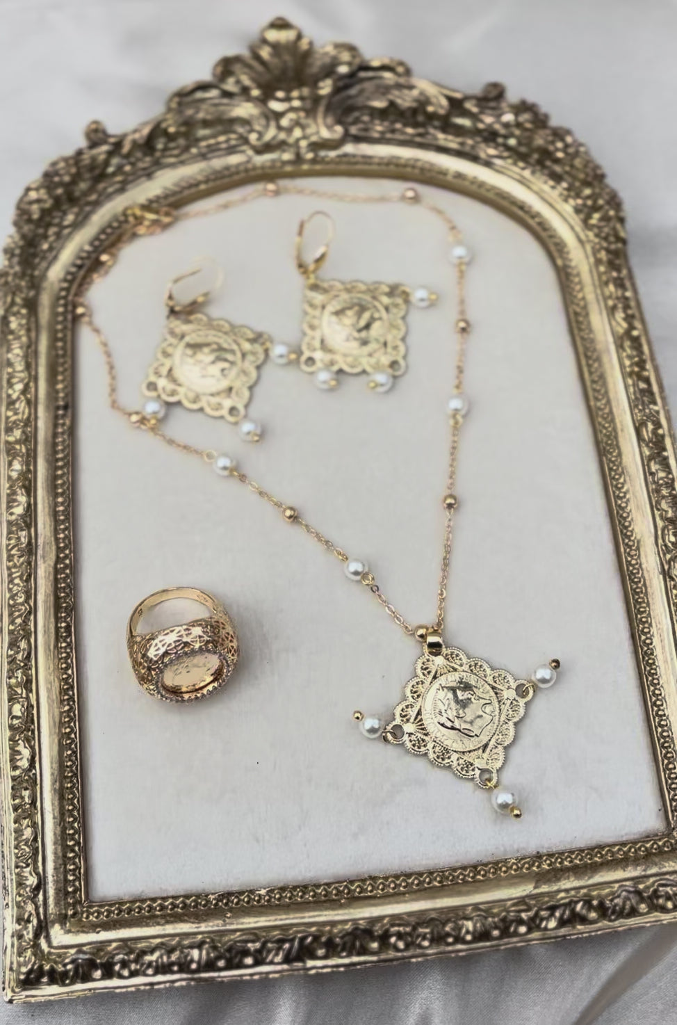 Chaque pièce dorée est ornée d’une pièce en Louis et de perles blanches nacrées.